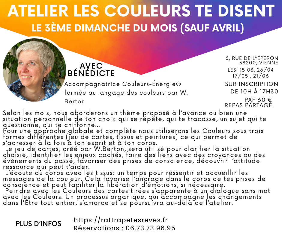 Cette journée te propose une rencontre au cœur de toi-même avec les Couleurs pour éclairer, explorer, clarifier, dénouer le thème choisi.